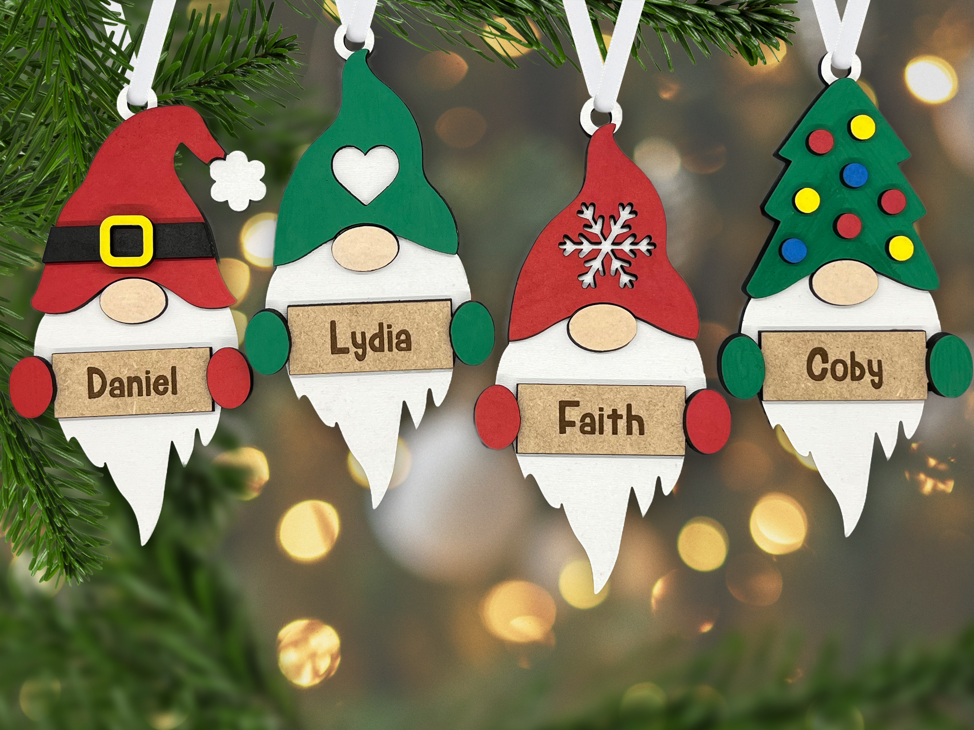 Choose from 3 different Gnome Hats: Sweater, Polka dot, or Reindeer. Every ornament is hand painted and there is the option of 2 different Christmas colors, Red or Green, for the hat.